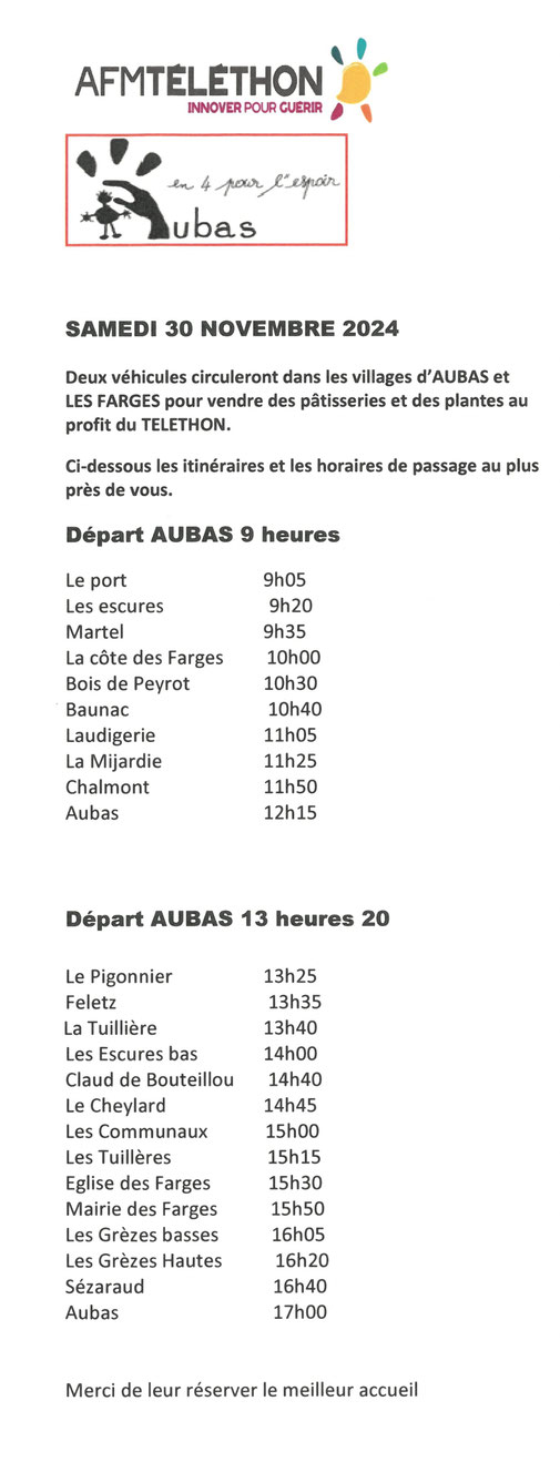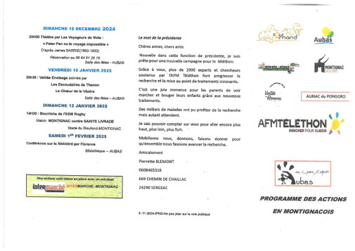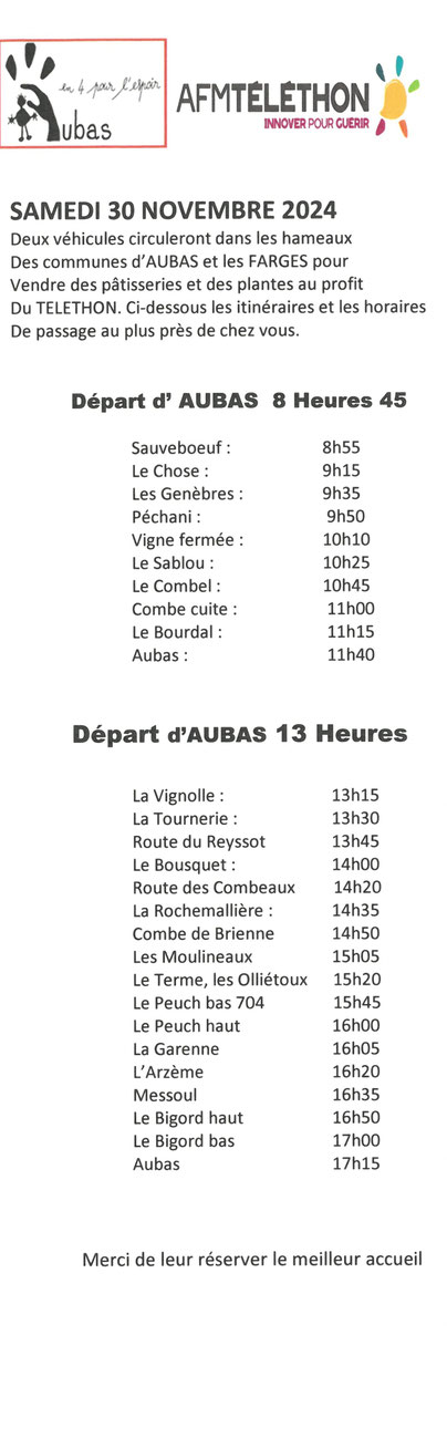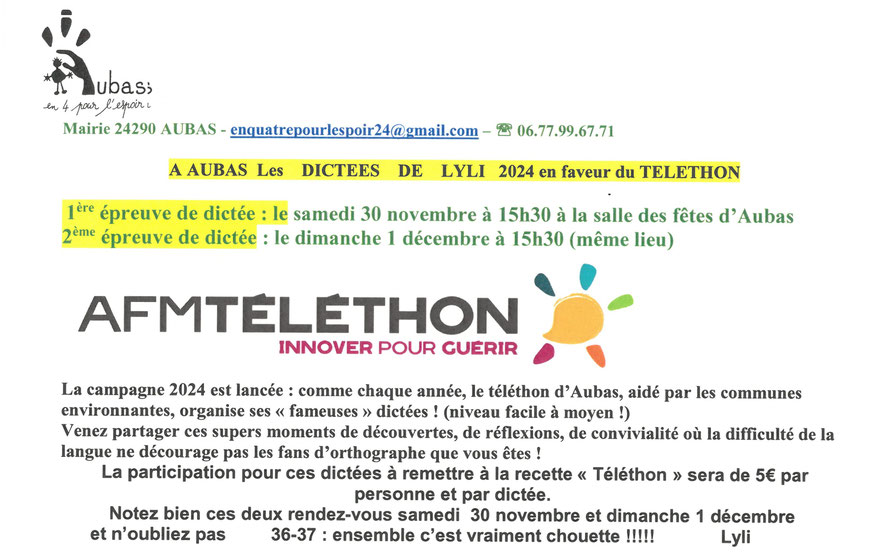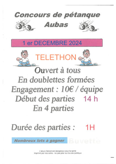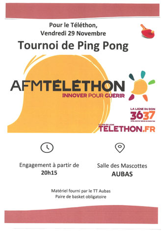 Dans le cadre du Téléthon, le Tennis de Table d'Aubas organise un tournoi loisirs de Ping Pong le Vendredi 29 Novembre à partir de 20h15 à la salle des Mascottes. Ce moment de sport, mais aussi de convivialité, est ouvert à toutes et tous: Licencié(e)s, parents, amis.... ( Info en pièce jointe, que vous pouvez partager) .Nous vous demandons de venir avec au moins une paire de basket ( raquettes et balles fournies par le club )